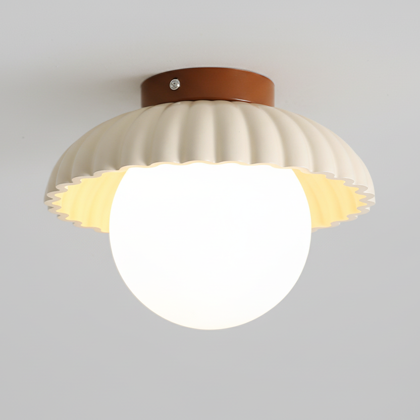 Ce petit plafonnier au charme rétro est idéal pour donner du caractère à un espace restreint. Avec son abat-jour en fer à la forme cannelée (style "cupcake" ou fleur) et son globe en verre opalin, il diffuse une lumière douce et chaleureuse. C'est le choix parfait pour dynamiser un couloir, une entrée ou une petite chambre avec une touche de couleur vintage.